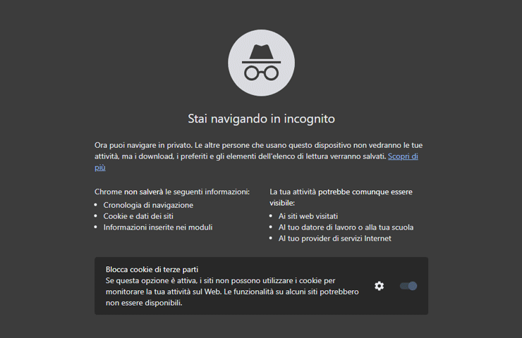 Molti browser web offrono la modalità di navigazione ‘in incognito’ che consente di avviare una sessione di navigazione ‘privata’. La offre anche Chrome, il browser web di Google. Le pagine web che vengono visitate ‘in incognito’ non vengono salvate sul dispositivo, così eventuali altri utenti del dispositivo non possono accedere alla cronologia e vedere l’attività.