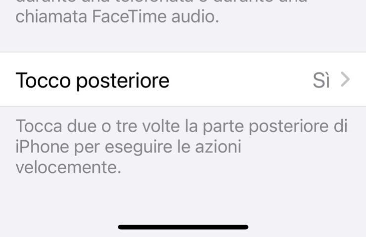 Una volta arrivato qui clicca su tocco e qui troverai tocco posteriore. A questo punto avrai un sacco di opzioni tra cui scegliere e tra quella che si può applicare quando toccherai due volte la mela dell’iPhone. Che potrà essere sfruttata per quello che si desidera, dagli screen a tanto altro.