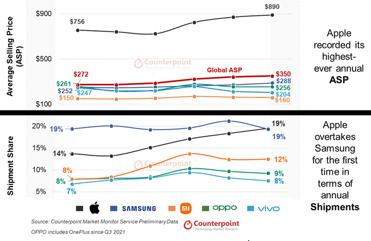 Al secondo posto si trova Samsung con una quota del 15% dei ricavi e un prezzo medio di vendita di 288 dollari dei suoi smartphone. Terza posizione per Oppo con una quota del 7% dei ricavi e un prezzo medio di vendita di 256 dollari dei suoi smartphone. Quarta posizione per Xiaomi con una quota del 6% dei ricavi e un prezzo medio di vendita di 160 dollari dei suoi smartphone. Quinta posizione per Vivo con una quota del 4% dei ricavi e un prezzo medio di vendita di 204 dollari dei suoi smartphone.