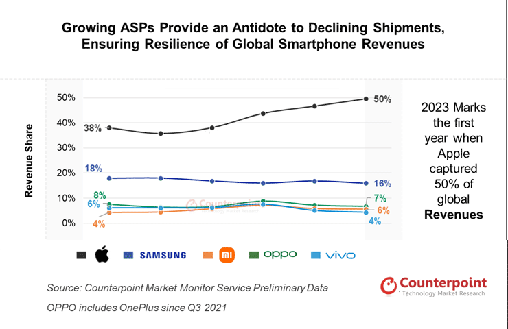 Secondo Counterpoint, Apple guida il mercato globale degli smartphone in termini di ricavi con una quota del 50%, segnando la percentuale più alta di sempre in un anno. Azienda che, ricordiamo, nel 2023 ha preso il posto di Samsung come principale fornitore di smartphone a livello mondiale per numero di spedizioni.