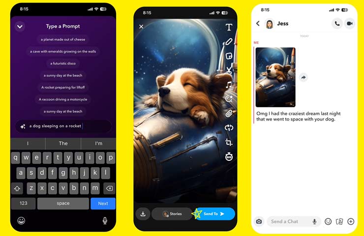 Ci sono novità in arrivo per gli abbonati a Snapchat+, altre funzionalità anch’esse alimentate dall’ia generativa. Tra queste, la funzionalità per creare e inviare immagini generate dall’ia partendo da un testo. Per fare degli esempi, si potrebbe chiedere all’ia di generare una immagine con “un cane che dorme su un razzo“, “una giornata di sole in spiaggia“, “un razzo che si prepara al decollo” oppure “un procione alla guida di una motocicletta“.