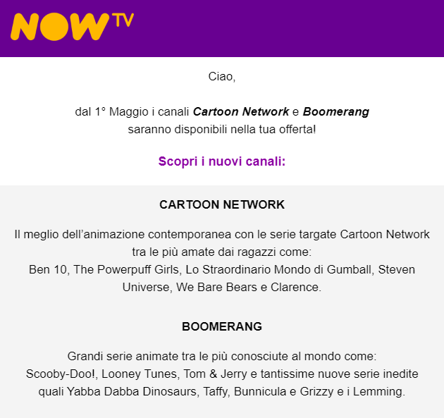 Esempio di mail informativa da NOW TV che comunica l’aggiunta dei canali Cartoon Network e Boomerang