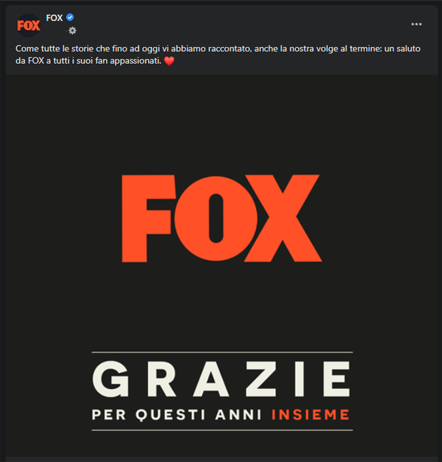 Riguardo lo spegnimento del canale FOX su Sky e NOW, la comunicazione ufficiale è arrivata dalle pagine social del canale il 30 giugno 2022: "Come tutte le storie che fino ad oggi vi abbiamo raccontato, anche la nostra volge al termine: un saluto da FOX a tutti i suoi fan appassionati." . Uno spegnimento che non sorprende: FOX, una proprietà Disney, è stato l’ultimo canale lineare a rimanere attivo su Sky da quando ha debuttato il servizio di streaming Disney Plus: si sapeva che prima o poi il giorno dello spegnimento di FOX sarebbe arrivato, dopo lo spegimento nei mesi scorsi di FOX Animation, FOX Crime, FOX Life e altri canali del brand FOX.