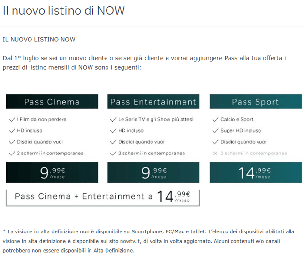 I Pass Cinema e Pass Entertainment continuano a permettere di vedere i contenuti in HD (non su smartphone, PC/Mac e tablet) e su due schermi in contemporanea. Il Pass Sport continua a non permettere la visione su 2 schermi in contemporanea.