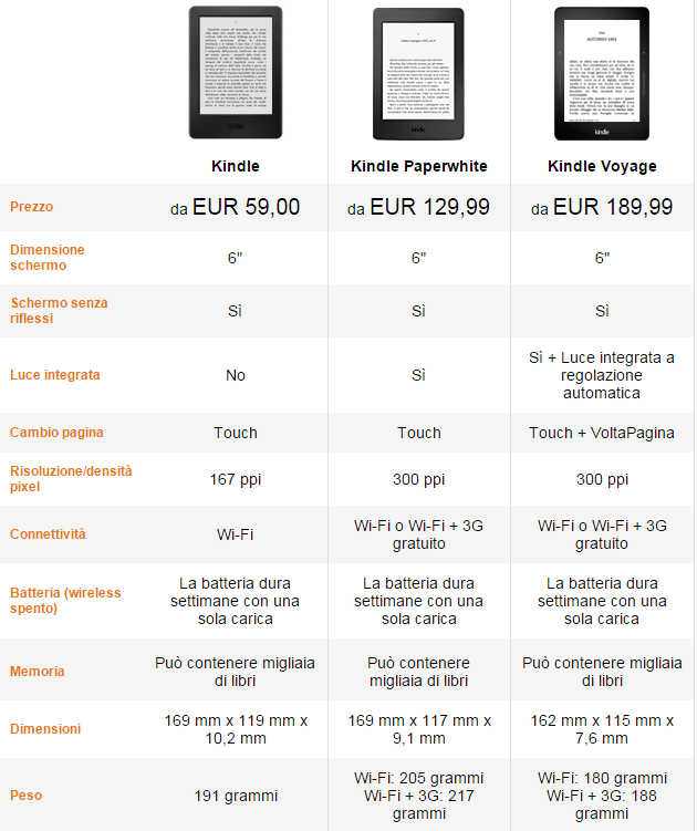 A guardare i due nuovi eReader sulla carta, il nuovo Kindle Paperwhite diventa quindi simile al Kindle Voyage, il quale ha in più rispetto al Paperwhite principalmente uno schermo di vetro e pulsanti separati sul lato per sfogliare le pagine. Amazon sottolinea che il Voyage ha in più anche un maggiore contrasto, schermo più luminoso – poche cose, che non valgono forse il pagamento di quasi 60 euro in più.