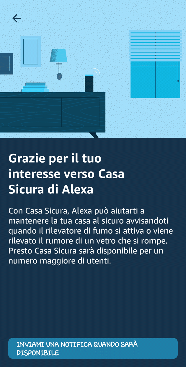 All’inizio del mese di febbraio, per alcuni giorni all’interno dell’all Alexa di Amazon per dispositivi Android è stata disponibile una sezione, ora rimossa, che ha anticipato l’arrivo in Italia, presumibilmente presto, della nuova funzionalità chiamata Casa Sicura. Nella pagina mostrata in italiano da Amazon nell’app Alexa era scritto che " Con Casa Sicura, Alexa potrà aiutare a mantenere la casa al sicuro avvisando quando il rilevatore di fumo si attiva o viene rilevato il rumore di un vetro che si rompe. presto Casa Sicura sarà disponibile per un numero maggiore di utenti" con un pulsante che invitava a dimostrare interesse verso la nuova funzionalità accettando di ricevere una notifica quando sarà disponibile. Presumibilmente Amazon sta testando con un gruppo ristretto di utenti italiani la funzionalità Casa Sicura di Alexa.