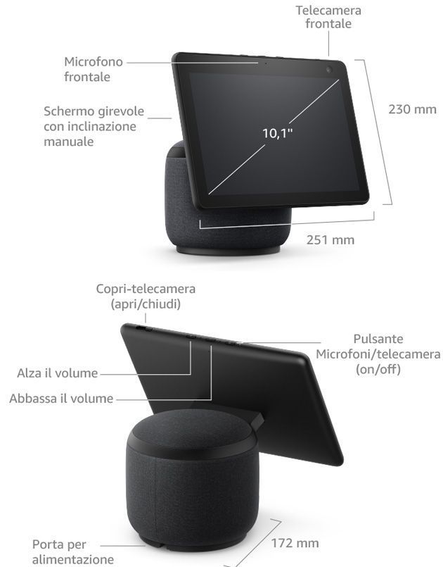 Dimentichiamoci l’Echo Show di 2a generazione (attualmente non più disponibile per la vendita su Amazon), il nuovo modello è stato completamente reinventato: il display LCD da 10.1 pollici non poggia a terra, è agganciato al bordo superiore dello smart speaker di forma cilindrica che funge da base ed emette il suono a 360 gradi. Le misure del prodotto sono 251x230x172mm e il peso complessivo è di 2560 grammi. All’interno si trovano un sistema audio stereo 2.1 composto da 2 tweeter da 1” (25 mm) e un woofer da 3” (76 mm). Questo smart display monta due processori: quello principale è un MediaTek 8183, mentre il secondario è con Amazon AZ1 Neural Edge. Presente anche un sensore di luce ambientale RGB. La fotocamera è frontale da 13MP.