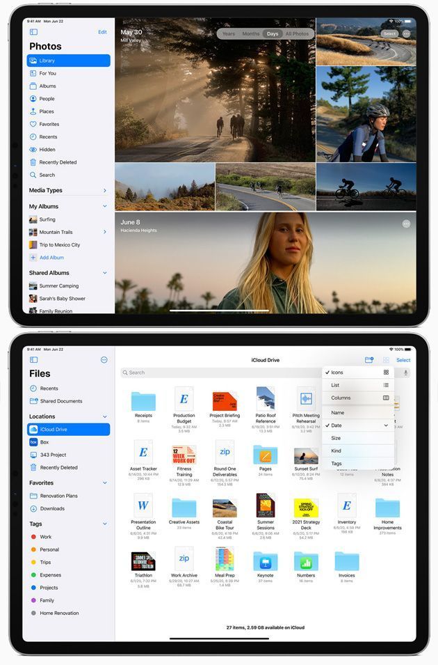 iPadOS 14 – barre laterali riprogettate in molte app, tra cui foto, file, note, calendario e Apple Music, consolidano la navigazione in un’unica posizione.