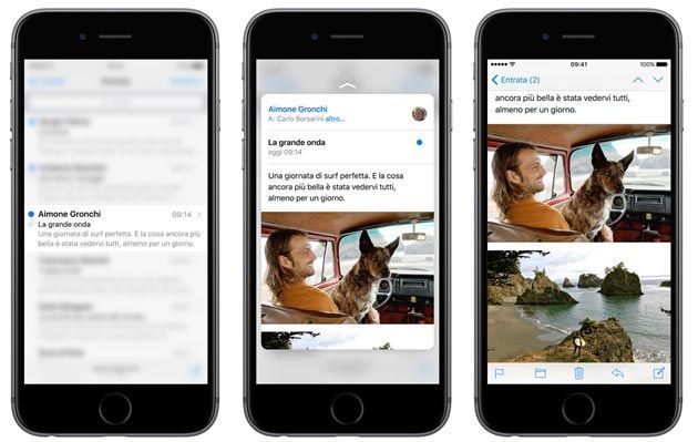 Con il 3D Touch è possibile scorrere la posta in arrivo in modo più veloce e funzionale. Se troviamo un messaggio interessante, è possibile premere leggermente e fare Peek, quindi riceviamo una rapida anteprima: il contenuto dell’email compare in una nuova finestra, sovrapposta all’elenco dei messaggi. Se il testo è breve, per leggerlo basta il Peek. E per tornare alla casella di posta, basta sollevare il dito. Se invece il messaggio è lungo e si vuole leggerlo tutto, si può premere un po’ più forte: grazie a Pop appare come se lo avessimo aperto direttamente dalla casella di posta in arrivo.
