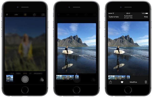 Altro esempio di utilizzo del 3D Touch con le foto. Se stiamo scattando delle foto e vogliamo vedere quelle che già fatte, è possibile premere leggermente sulla miniatura della foto per avere un Peek. A questo punto compare una barra di scorrimento, con cui muoverci tra le foto. Per rivederle si può tenere premuto e scorrere verso sinistra. Sollevando il dito torniamo invece a scattare. Per aprire invece una foto, si può passare dal Peek al Pop: premendo più forte si può condividere, contrassegnarla come preferita, ritoccarla o eliminarla.