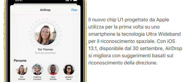 All’atto pratico, il chip U1 serve per migliorare AirDrop – la tecnologia di Apple che consente di condividere istantaneamente contenuti, come foto, video, documenti e altro ancora con altri dispositivi Apple nelle vicinanze – con suggerimenti basati sul riconoscimento della direzione. Infatti, il chip U1 permette all’iPhone di localizzare con precisione gli altri dispositivi Apple vicini che ne sono dotati.