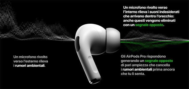 La funzione di cancellazione attiva del rumore degli AirPods Pro sfrutta due microfoni combinati ad un software per adattare continuamente – fino a 200 volte al secondo – il suono su ogni auricolare per eliminare i rumori di fondo e migliorare l’esperienza di ascolto. Un primo microfono è rivolto verso l’esterno e ha il compito di rilevare il suono esterno analizzando il rumore ambientale, quindi gli auricolari producono un suono equivalente opposto che cancella il rumore di fondo prima che arrivi all’orecchio di chi ascolta. Un secondo microfono è rivolto verso l’interno, capta i suoni trasmessi verso l’orecchio, quindi gli AirPods Pro cancellano il rumore residuo rilevato dal microfono.
