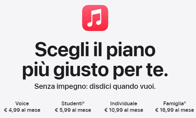 Un primo segnale che ‘la musica stava cambando’ lo abbiamo avuto la scorsa estate, quando Apple ha aumentato di 1 euro il canone mensile del piano Studenti di Apple Music, passato da 4,99 euro/mese agli attuali 5,99 euro/mese. Ora, l’azienda di Cupertino ha deciso di aumentare, da subito senza alcun preavviso, il costo anche dei piani Individuale e Famiglia, rispettivamente da 9,99 euro/mese a 10,99 euro/mese (+1 euro/mese) e da 14,99 euro/mese a 16,99 euro/mese (+2 euro/mese). Per il momento, resta invariato il costo del piano Voice a 4,99 euro/mese. L’aumento del canone di abbonamento non porta con sè nuove funzionalità o aggiornamenti di funzionalità già disponibili: Apple ha solo aumentato i prezzi.
