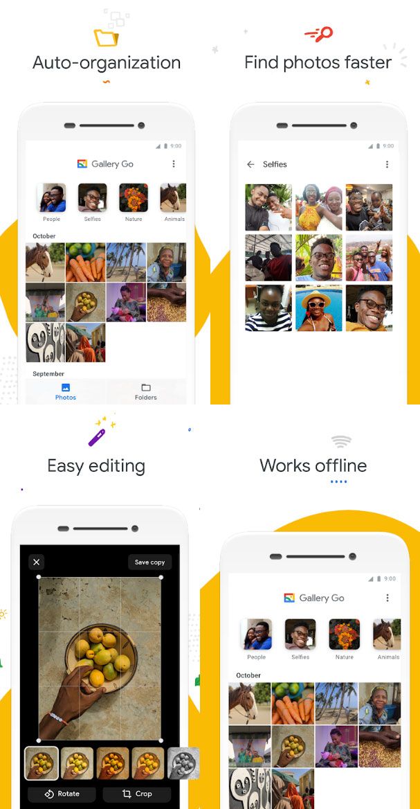 Ogni notte, Gallery Go organizza automaticamente le foto in base alle persone e alle cose trovate negli scatti raggruppandole in Persone, Selfie, Natura, Animali, Documenti, Video e Filmati. Non è necessario etichettare manualmente le foto e tutte queste funzioni vengono eseguite sul telefono, senza scambio di dati, quindi funziona anche in modalità offline senza connettività ad internet. E’ possibile anche creare cartelle per organizzare le foto e Gallery Go funziona con le schede SD, in modo da poterle facilmente copiare dal telefono sulla scheda di memoria esterna (e viceversa).
