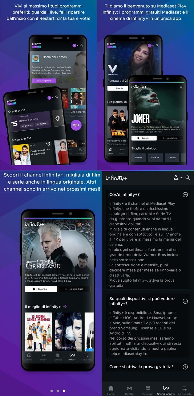 Come parte del debutto di Mediaset Play Infinity, l’app mobile Mediaset Play per dispositivi iOS, Android e Huawei è stata aggiornata e rinominata in ‘Mediaset Play Infinity’. Lo stesso sugli smart tv dove era disponibile l’app Mediaset Play e/o Infinty. Ad esempio, sui televisori Android TV l’app Infinity è ora ‘Mediaset Play Infinity tv‘. In generale, i dispositivi su cui è già disponibile (o è prevista la disponibilità) di Mediaset Play Infinity sono: PC e Mac via web all’indirizzo www.mediasetplay.mediaset.it tramite un browser abilitato (Google Chrome, Mozilla Firefox, Apple Safari, Microsoft Edge); Smartphone e tablet Apple iOS (v11.0 e successive), Android (v5.0 e successive) e Huawei; Smart TV: Samsung Orsey (serie 2011, 2012, 2013, 2014 2015), Samsung Tizen (serie 2015 e successive), LG Netcast (serie 2014 e precedenti), LG WebOS (serie successive al 2014), Hisense (serie 2015 e successive), Android TV, Amazon Fire stick; Console da gioco NVIDIA – Shield, RAZER – Forge. Non è/sarà più possibile accedere a Mediaset Play e/o Infinity su alcuni dispositivi, in quanto ormai obsoleti, tra cui decoder o set-top-box (non Android). In ogni caso, basta cercare ‘Mediaset Play Infinity’ sullo store del proprio device per scoprire se l’app è disponibile (sviluppata da "RTI Spa").
