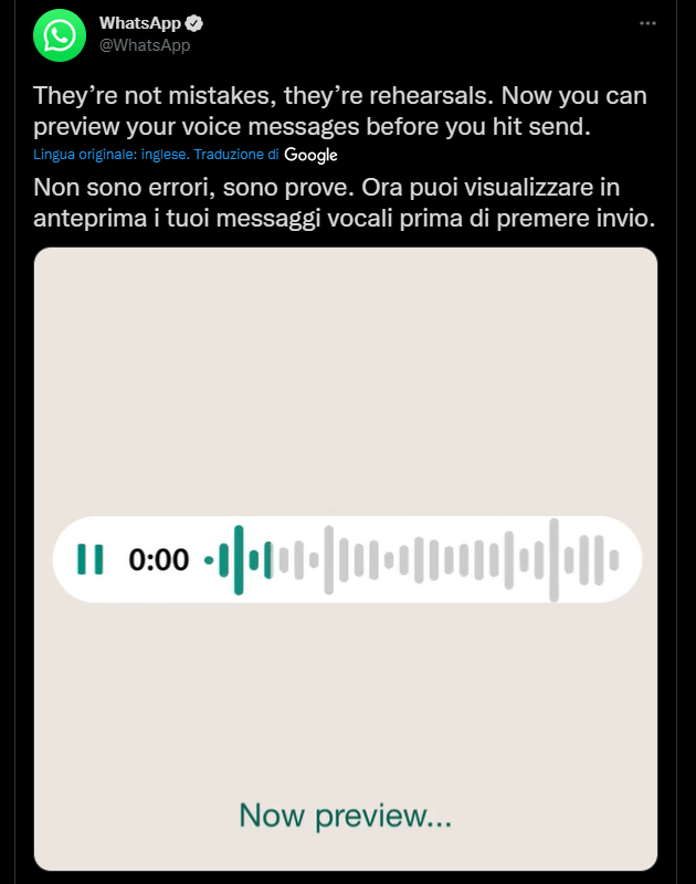 "They’re not mistakes, they’re rehearsals. Now you can preview your voice messages before you hit send.".