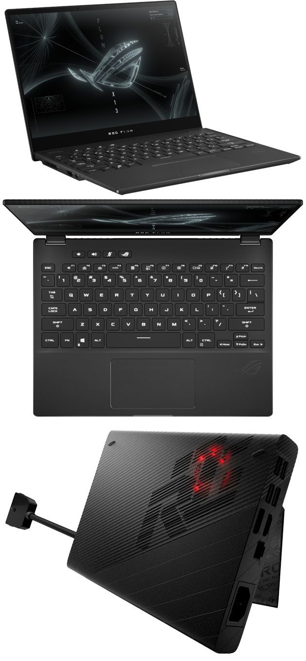 ROG Flow X13 è un notebook da gaming da 13 pollici protetto da vetro Corning Gorilla Glass con design convertibile che ruota lo schermo di 360 gradi e con CPU mobile AMD Ryzen 9 5980HS ad alta efficienza energetica con grafica NVIDIA GeForce GTX 1650. In dotazione viene fornito un carica batterie USB-C PD da 100 watt che consente di ricaricare la batteria da zero al 60% in 39 minuti. Il display può essere FHD 120Hz oppure 4K, in entrambi i casi con rapporto di aspetto di 16:10, supporto per la funzione Adaptive-Sync e validazione Pantone. Presenti due speaker di tipo "down-firing" con supporto Dolby Atmos e sistema Two-Way AI Noise Cancelation per la cancellazione bidirezionale del rumore assistita da IA. Flow X13 è abbinabile a XG Mobile, una GPU esterna con grafica NVIDIA GeForce RTX 3080 che consente al notebook di raggiungere una potenza di elaborazione grafica maggiore. Il connettore proprietario eGPU offre una larghezza di banda fino a ben 63 Gbps, più delle eGPU con connessione Thunderbolt. XG Mobile integra anche il collegamento dedicato USB 3.2 Gen 2, che alimenta un hub input/output per la connettività aggiuntiva, e un alimentatore integrato da 280 watt. A mantenere basse le temperature interne ci pensa il sistema di raffreddamento a metallo liquido con tre dissipatori di calore e sfoghi per le ventole Arc Flow che migliorano il flusso d’aria fino al 15% senza fare più rumore e dispongono del sistema di pulizia automatica.