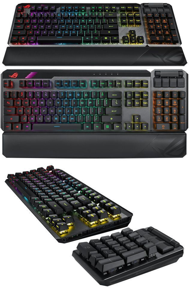 ROG Claymore II è una prima tastiera meccanica da gaming con switch ROG RX Blue Optical Mechanical Switches, una soluzione che sfrutta una struttura a quadrato vuoto e LED RGB incorporati che circondano ogni singolo tasto. Asus promette una reazione dei tasti nel momento in cui avviene la pressione grazie anche alla struttura quadrata e incavata, le quattro chiusure angolari dei copritasti e al meccanismo di stabilizzatore a X, garantendo una durata per 100 milioni di pressioni. La tastiera viene fornita di un poggiapolsi magnetico e di un tastierino numerico con quattro tasti personalizzabili staccabile e collegabile su entrambi i lati della tastiera. Claymore II è disponibile anche con ROG RX Red Switch. Le tastiera offre connessioni USB-C e wireless RF a 2.4GHz, dispone di una batteria da 4.000mAh con autonomia fino a 40 ore con una singola carica. La batteria si ricarica tramite USB-C, porta che può servire anche da "USB passthrough" per collegare altri dispositivi. Inoltre, Claymore II ha illuminazione Aura Sync ed è personalizzabile tramite il software Armoury Crate.