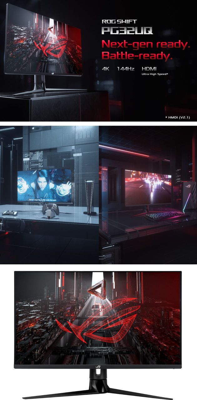ROG Swift PG32UQ è un monitor da gaming con pannello IPS a 144Hz da 32 pollici con tempo di risposta di 1ms (MPRT) e due porte HDMI 2.1 con supporto per video 4K fino a 120Hz. Supporta lo standard di compressione Display Stream Compression (DSC) per fare transitare flussi video ad alta definizione su una singola interfaccia ad alta velocità senza perdita percettibile di qualità visiva. Può anche visualizzare immagini in 4K a 144Hz tramite una connessione DisplayPort 1.4. PG32UQ è compatibile con G-SYNC e supporta le tecnologie ASUS Extreme Low Motion Blur Sync (ELMB Sync) e ASUS Variable Overdrive per immagini fluide a frame rate variabili. Il PG32UQ è certificato DisplayHDR 600, supporta il 160% dello spazio colore sRGB e il 98% del gamut DCI-P3 ed è pre-calibrato in fabbrica per colori più accurati con Delta E<2.