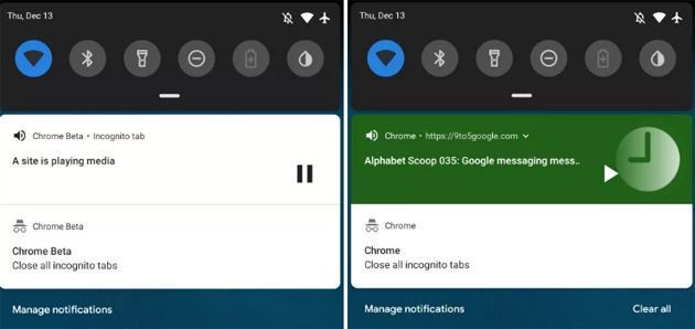 Su Android, Chrome 72 le notifiche che fanno riferimento ad un contenuto multimediale riprodotto da una scheda di Chrome in incognito sono anonime, non mostrano più il dominio, il titolo della pagina o la grafica del sito da cui il video/audio è riprodotto. E il background della notifica è neutro, non ha lo stesso tema del sito. La notifica mostra al posto del dominio il titolo ‘scheda in incognito’ mentre al posto del titolo del contenuto in riproduzione mostra che "un sito sta riproducendo contenuti multimediali" con il pulsante di riproduzione/pausa. Non ci sono cambiamenti per le notifiche multimediali riguardanti le schede non-in-incognito, quindi in queste resta visibile il background personalizzato, il titolo, il dominio e altre informazioni dalla pagina web da cui proviene il contenuto.