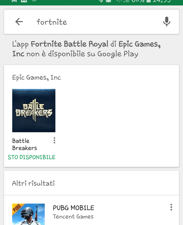 Infatti, semplicemente cercando ‘Fortnite’ nel Play Store si viene notificati che "L’app Fortnite Battle Royal di Epic Games, Inc non è disponibile s Google Play".