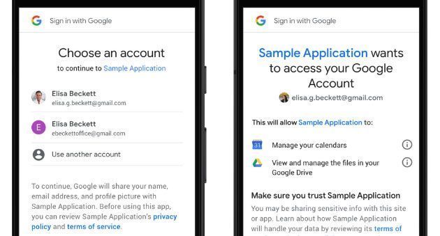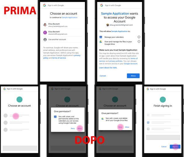Quando un’applicazione richiede l’accesso ai dati del proprio account Google, in una finestra vengono elencati a quali dati l’app richiede accesso e l’utente deve concederne l’autorizzazione esplicita. In futuro, i consumatori otterranno un controllo più dettagliato sui dati dell’account che scelgono di condividere con ciascuna app. Invece di visualizzare tutte le autorizzazioni richieste in un’unica schermata, le app dovranno mostrare ogni autorizzazione richiesta, una alla volta, all’interno della propria finestra di dialogo. Ad esempio, se uno sviluppatore richiede l’accesso sia alle voci del calendario e ai documenti di Drive, sarà possibile scegliere di condividerne uno, ma non l’altro.