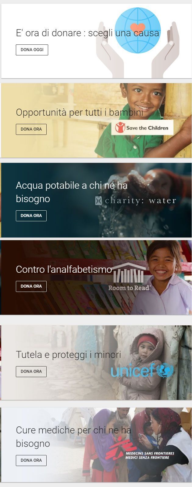 Google ha aperto all’interno del suo Play Store una sezione in cui abbraccia i progetti di diverse organizzazioni umanitarie e ambientaliste, alle quali invita gli utenti Android ad effettuare donazioni. Al momento in cui scriviamo, attraverso il Play Store dall’Italia si puo’ donare a Save the Children, Charity: Water, Room to read, Unicef, Medici senza frontiere.