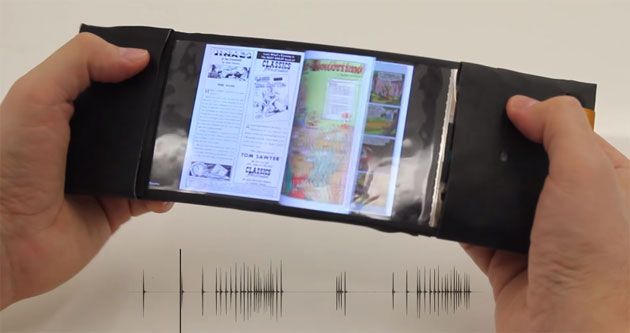 Per esempio, mentre si piega dal basso verso l’alto il lato destro del display, le pagine di un libro digitale potrebbero essere sfogliate proprio come si farebbe su un libro nella vita reale. Inoltre, piu’ lo schermo si piega, piu’ velocemente possono essere sfogliate le pagine di un e-book.