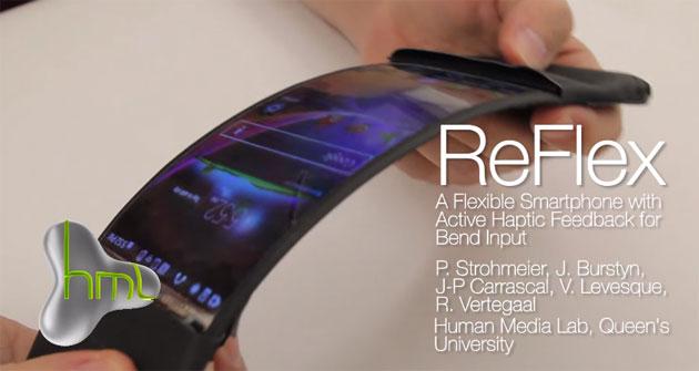 Svelato dallo Human Media Lab di Queen’s University il 17 febbraio nel corso di un convegno in Olanda che tratta delle interazioni tra i computer e gli esseri umani, ReFlex integra un sensore in grado di determinare quanto lo schermo è piegato e utilizza lo schermo flessibile per attivare determinate funzioni sfruttando anche il feedback tattile..