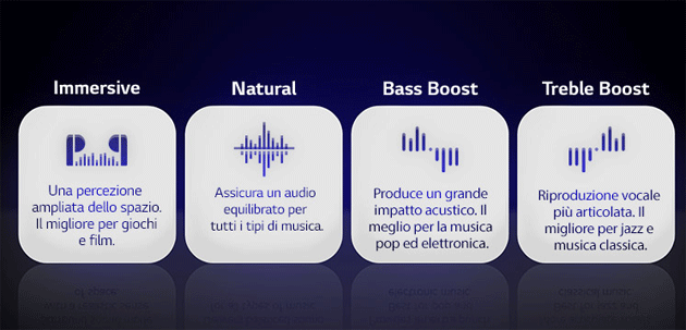 Le cuffie LG TONE Free True Wireless integrano la tecnologia HSP (Headphone Spatial Processing) di Meridian Audio basata sul Digital Signal Processing ed è presente un equalizzatore sviluppato dall’azienda inglese che permette di personalizzare la riproduzione del suono offrendo quattro preset per ogni modalità per un’esperienza di ascolto su misura: ‘Natural’ per un suono bilanciato, ‘Immersive’ per un senso di spazio più ampio, ‘Bass Boost’ per una spinta aggiuntiva e ‘Treble Boost’ per rendere piu chiare le performance vocali. L’isolamento acustico dai rumori esterni è garantito dalle estremità in gomma che si adattano alla forma dell’orecchio, mentre la funzione Ambient Sound Mode consente di sentire cosa succede nell’ambiente circostante premendo un pulsante.