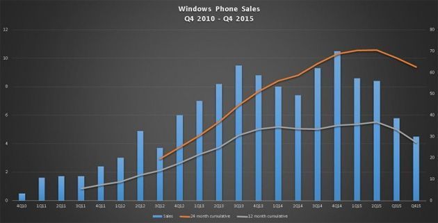 Le vendite di telefoni Lumia nei tre mesi da ottobre a dicembre 2015 sono calate da 10,5 milioni di unità registrate nello stesso trimestre dell’anno precedente. Anche con il lancio di Windows 10 Mobile sui nuovi smartphone Microsoft Lumia 950 e Microsoft Lumia 950 XL le vendite di telefoni Windows Phone sono diminuite del 49% rispetto lo stesso periodo dell’anno precedente.