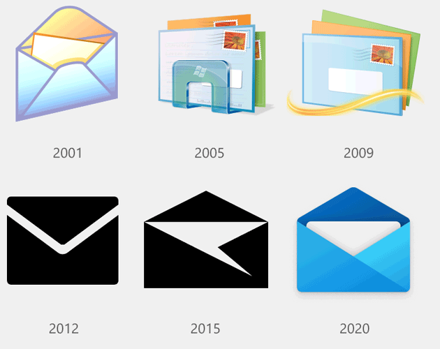 Evoluzione icona Windows Mail nel tempo, dal 2011 al 2020