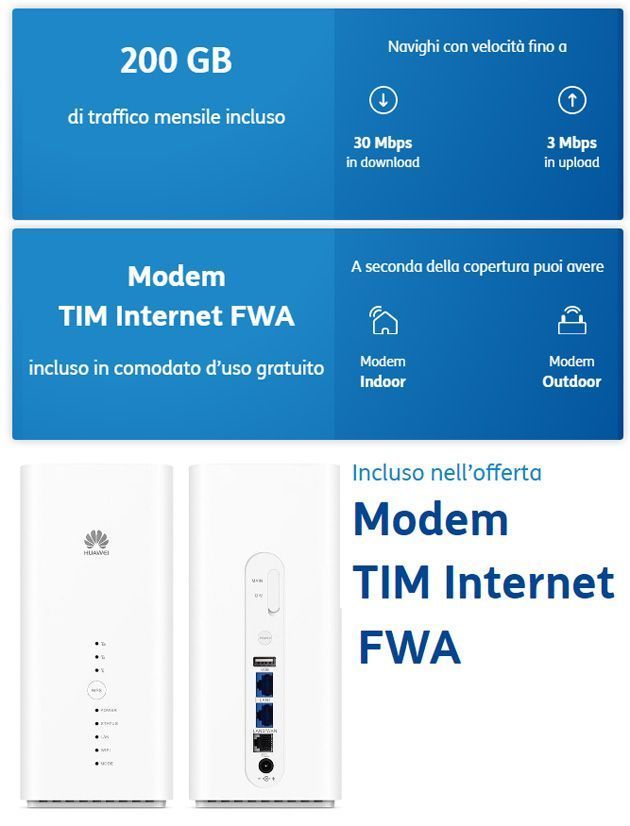 Il prezzo di attivazione e il costo del Modem FWA, Outdoor o Indoor, fornito da TIM in comodato d’uso gratuito, sono inclusi nell’offerta. L’installazione del modem "Outdoor" richiede l’intervento a domicilio di un tecnico TIM specializzato, al costo di 99,0 euro pagabili in un’unica soluzione o in 24 rate mensili da 4,13 euro). Qualora venga richiesta la disdetta/cessazione dell’offerta, l’eventuale pagamento a rate del Modem TIM sarà mantenuto attivo fino alla scadenza delle rate residue, a meno che con l’esercizio della disdetta/cessazione, o in qualsiasi momento successivo, non sia indicata la volontà di pagare in un’unica soluzione. Il Modem FWA "Indoor" è inviato gratuitamente a casa, e bisognerà provvedere autonomamente all’installazione dello stesso. La durata di fatturazione dell’offerta è pari a 30 giorni.