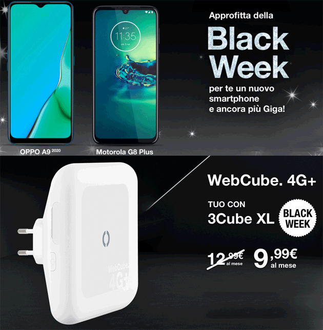Infine, 3 propone l’offerta "WebCube. 4G+ con 3Cube XL Black" al prezzo di 9,99 euro al mese, azichè 12,99 euro al mese. L’offerta prevede l’abbonamento 3Cube XL per navigare 80 giga al mese di giorno mentre di notte (da mezzanotte alle 8) senza limiti abbinato all’acquisto del dispositivo Wi-Fi WebCube. 4G+. La rateizzazione legata al terminale prevede una durata di 30 mesi con l’anticipo di 0 euro.
