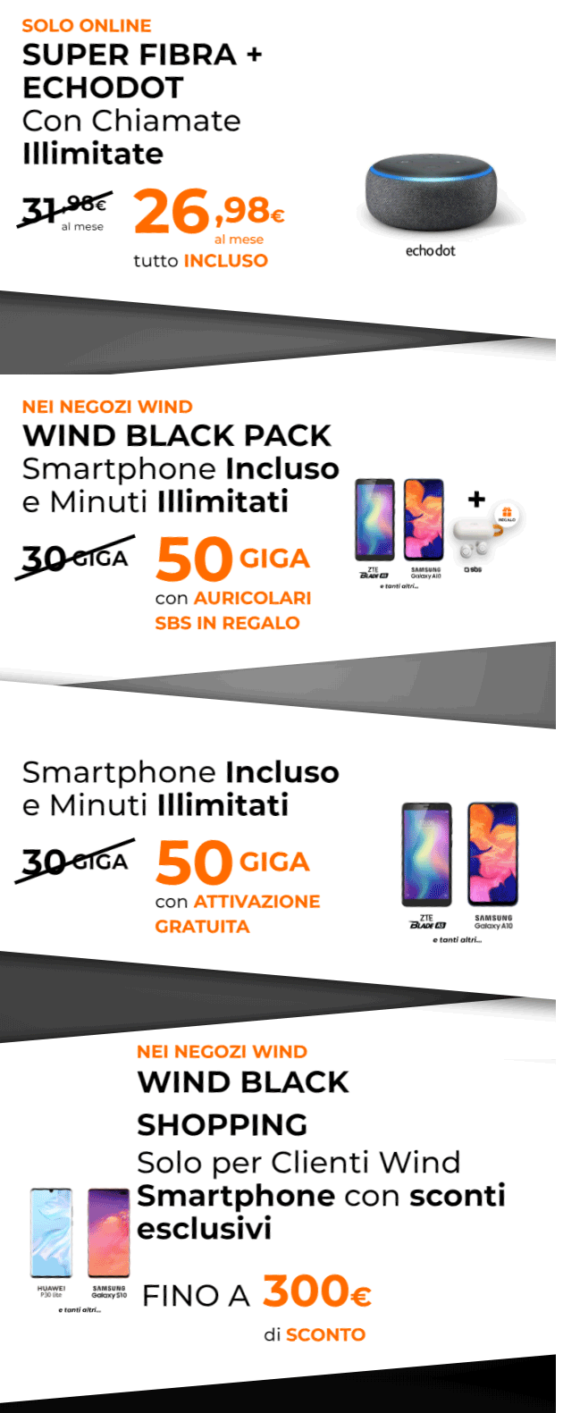 Per quanto concerne le proposte di Wind, solo online è possibile attivare l’offerta di rete fissa "Super Fibra + EchoDot con chiamate illimitate" a 26,98 euro/mese. Consente di avere chiamate da fisso incluse senza limiti verso tutti i numeri Fissi e Mobili Nazionali e verso i numeri Fissi di Europa Occidentale, Usa e Canada oltre ad internet con velocità di navigazione al massimo disponibile per la propria abitazione (FIBRA 1000 in FTTH con fino a 1000 Mb/s in download e 100 Mb/s in upload by Open Fiber; Internet 200 in FTTC con fino a 200 Mb/s in download e 20 Mb/s in upload; Internet 100 in FTTC con fino a 100 Mb/s in download e 20 Mb/s in upload in FTTC; Internet 20 in ADSL confino a 20 Mb/s in download e 1 Mb/s in upload in ADSL; Internet 7 in ADSL con fino a 7 Mb/s in download e 256 Kb/s in upload in ADSL). L’offerta in fibra FTTH (Fiber to the Home) è disponibile in alcuni indirizzi nelle città coperte da Open Fiber. In caso di ADSL a 7 Mb/s, l’offerta costa 33,98 euro/mese e non 26,98 euro/mese. Il costo di attivazione di 120 euro, rateizzati in 24 rate mensili da 5 euro, è in promozione a 0 euro/mese. Chi completa l’attivazione di Super Fibra da web entro il 12 gennaio 2020 potrà recarsi presso un punto vendita Wind per ritirare uno smart speaker Echo Dot (viene fornito secondo la modalità Telefono Incluso, legato alla SIM dati 100 GIGA, prevede: un contributo iniziale di 0 euro, rata mensile 0 euro e una rata finale di 59,90 euro, scontata in caso di rispetto della durata contrattuale di 24 mesi).
