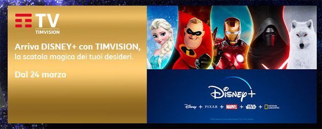 Disney e TIM annunciano in Italia l'accordo per la distribuzione esclusiva di Disney Plus in abbinamento con le offerte di banda larga.