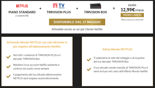 L’offerta ‘Mondo Netflix’ di TIM è attivabile dai clienti di rete fissa TIM dal 27 maggio 2020 – anche per chi è già cliente Netflix – al un prezzo di lancio di 12,99 euro al mese (anziché 19,99 Euro/mese) senza vincoli di durata e consente l’accesso al catalogo completo di contenuti di TIMvision Plus e Netflix (piano standard), oltre ad includere il decoder TIMvision Box.