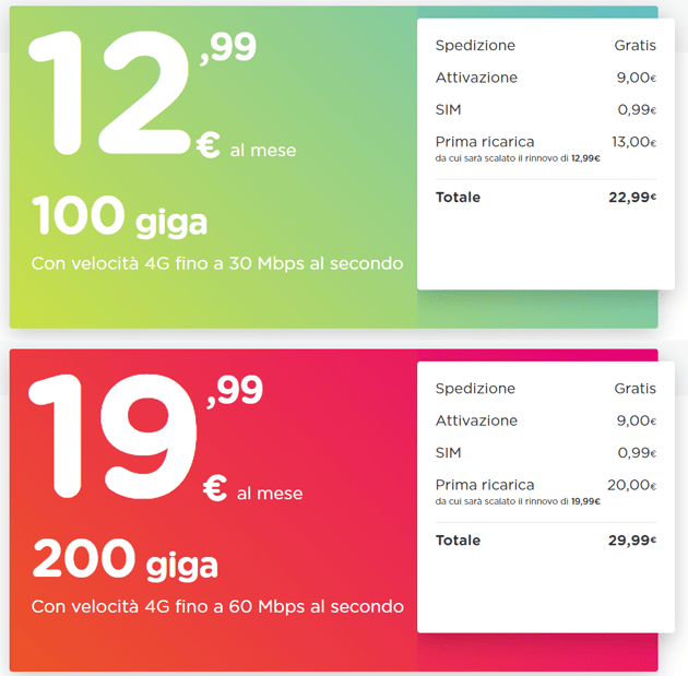 Nel caso di acquisto online è prevista la spedizione gratuita, il costo di attivazione di 9 euro, il costo della SIM di 0,99 euro e il costo della prima ricarica: di 13 euro scegliendo la versione con 100GB mensili, da cui sarà scalato il primo rinnovo di 12,99 euro, per un totale di 22,99 euro; oppure di 20 euro scegliendo la versione con 200GB mensili, da cui sarà scalato il primo rinnovo di 19,99 euro, per un totale di 29,99 euro. Dal secondo mese si pagheranno solo 12,99 euro o 19,99 euro (più gli eventuali costi per il consumo di chiamate e SMS, se si faranno).