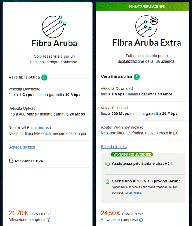 La Fibra di Aruba per aziende e professionisti si articola in due proposte, Fibra Aruba e Fibra Aruba Extra. Questa offerta è dedicata per connettere la propria azienda alla fibra al costo di 21,70 euro + IVA al mese con possibilità di utilizzare il proprio router o noleggiarlo. Scegliendo l’offerta Fibra Aruba Extra, a 24,50 euro + IVA al mese, sono disponibili servizi e condizioni riservate quali l’assistenza prioritaria e via chat h24, quindi un canale di assistenza dedicato con gestione prioritaria delle richieste. Inoltre, nell’opzione Extra, sono previsti sconti riservati fino all’80% sull’acquisto di ulteriori servizi e prodotti Aruba, utili alla digitalizzazione della propria azienda quali la PEC, l’hosting, la fatturazione elettronica, le firme digitali e i servizi cloud. L’attivazione è inclusa nel costo mensile complessivo del servizio.