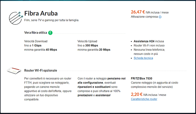 La Fibra di Aruba per privati è disponibile a partire da 26,47 euro al mese, con possibilità di utilizzare il proprio router o noleggiarlo (il FRITZBox! 7530) a 2,20 euro aggiuntivi al mese e con attivazione e configurazione gratuita da parte di un tecnico specializzato. Inoltre, anche per i privati, è disponibile l’offerta Fibra Aruba Extra da 29,89 euro al mese. L’attivazione è inclusa nel costo mensile complessivo del servizio.