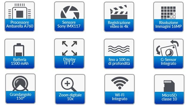 La Stonex Cam viene alimentata da un processore Ambarella A760 e monta un sensore Sony IMX117 in grado di registrare video in 4k, 2,7k,1080p/60 fps e 720p/120 fps per una risoluzione massima di 16 Mpixel. L’obiettivo ha grandangolo 150 gradi e lo zoom digitale arriva a 10x. La batteria è removibile da 1500 mAh. Il display TFT da 2 pollici non è integrato ma è removibile. Nella confezione di vendita viene inclusa una custodia impermeabile fino a 100 m di profondità. Altre specifiche includono il sensore Giroscopio e la connettività WiFi oltre al supporto MicroSD classe 10 fino a 64 GB.