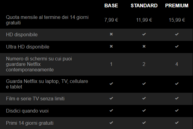 Il piano Standard da 10,99 euro è passato a 11,99 euro (+1 euro rispetto al 2017, +2 euro rispetto al 2015), mentre il piano Premium da 13,99 dollari è passato a 15,99 euro (+2 euro rispetto al 2017, +4 euro rispetto al 2015). Non ci sono altre variazioni, il piano Base costa ancora 7,99 euro.
