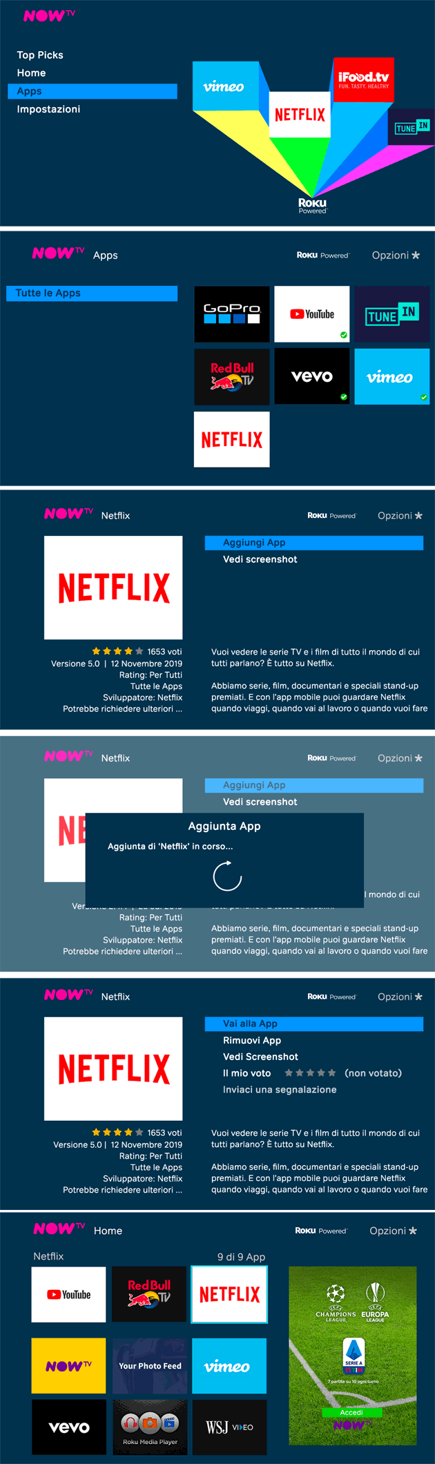 Come frutto della partnership tra Netflix e Sky annunciata nei mesi scorsi, dal 9 ottobre l’applicazione di Netflix è disponibile su Sky Q per gli abbonati a Sky, via fibra o satellite, con decoder Sky Q. Tuttavia, come parte dello stesso accordo, anche per i clienti di NOW TV, la Internet TV di Sky, era stata promessa ed è ora disponibile, dal 14 novembre, l’app Netflix sui dispositivi NOW TV, in particolare sulla NOW TV Smart Stick e sul NOW TV Box che, prodotti da Roku, consentono facilmente di accedere all’offerta completa di NOW TV oltre che ai servizi dei partner tramite le rispettive app, come DAZN e Youtube.