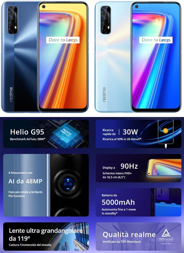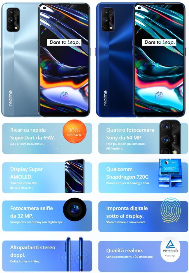 Batteria e processore – Realme 7 viene alimentato da una batteria da 5000mAh che supporta la ricarica rapida a 30W e un chipset octa-core Helio G95 con clock fino a 2.05GHz e GPU ARM Mali-G76 MC4 supportato da 6GB/8GB di RAM LPDDR4x, mentre lo storage ammonta a 64GB/128GB UFS 2.1. Realme 7 Pro monta una batteria da 4500mAh che supporta la ricarica rapida 65W SuperDart Charge (al 42% in 10 minuti di ricarica, al 100 per cento in 34 minuti di ricarica) e un chipset octa-core Qualcomm Snapdragon 720G con clock fino a 2.3GHz e GPU Adreno 618 supportato da 6GB/8GB di RAM LPDDR4x Dual-channel, mentre lo storage ammonta a 128GB UFS 2.1. Realme 7 ha una autonomia stimata a fino 48 ore in conversazione, 9 ore di gioco, 15 ore di riproduzione video e 81 ore di ascolto musicale. Il processore Helio G95 è dotato di un sistema di raffreddamento in fibra di carbonio che può raffreddare fino all’8,6%, mantenendo le prestazioni del telefono al massimo della velocità.