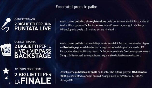 Samsung mette in palio i biglietti per i live di X Factor 2015 per chi acquista e registra i prodotti Samsung sul sito Samsung People. In paio biglietti per assistere come pubblico ad una delle puntate serali live di X Factor, i VIP Pass per accedere al backstage e biglietti per assistere alla finale di X Factor del 10 Dicembre.
