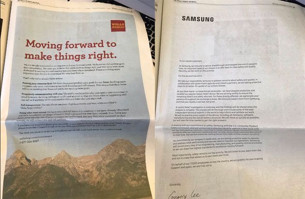 La società ha già detto che intente concentrarsi per tutto il 2017 su cosa fare per ritrovare la fiducia persa dei consumatori, e un primo passo verso questo obiettivo pare sia proprio aver pagato per la pubblicazione di un annuncio di scuse a tutta pagina nei tre maggiori quotidiani americani di carta stampata – The New York Times, il Wall Street Journal e il Washington Post.