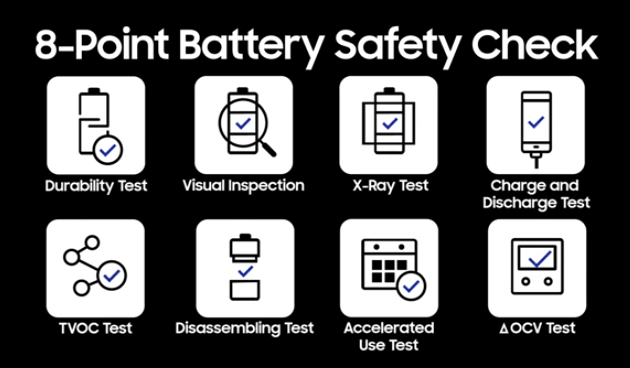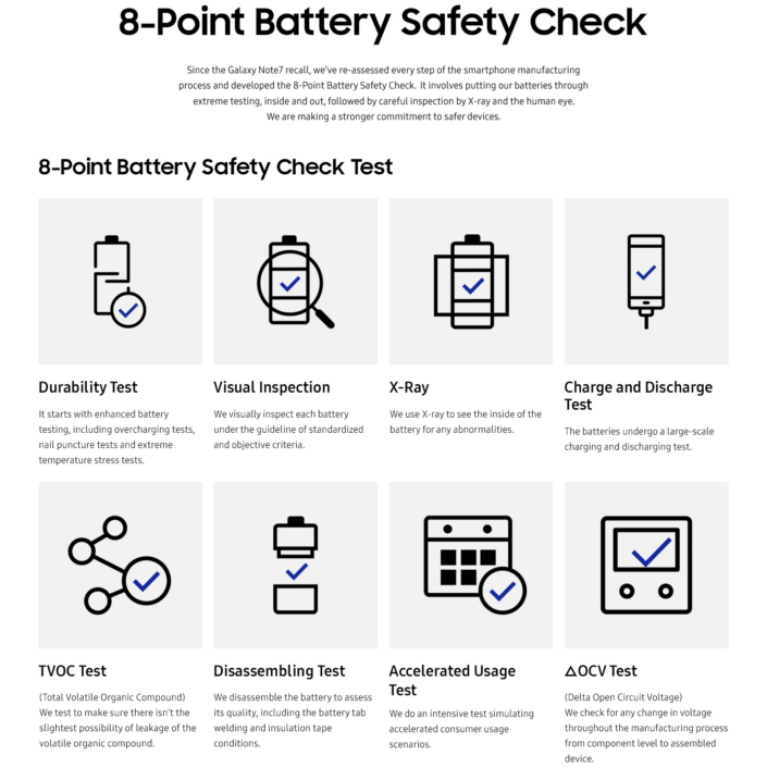 Con il test ‘8-Point Battery Safety Check‘ per la sicurezza delle batterie, Samsung si impegna a controllare le batterie dall’assemblaggio alla spedizione dei dispositivi. Tra i cinque test di controllo principali (Prova di durata, Ispezione Visiva, prova raggi-X (X-Ray Test), Smontaggio di prova e Test OCT) se ne aggiuntono tre: prova di carica e scarica (Charge and Discharge Test), test TVOC e test di utilizzo accelerato (Accelerated Usage Test).