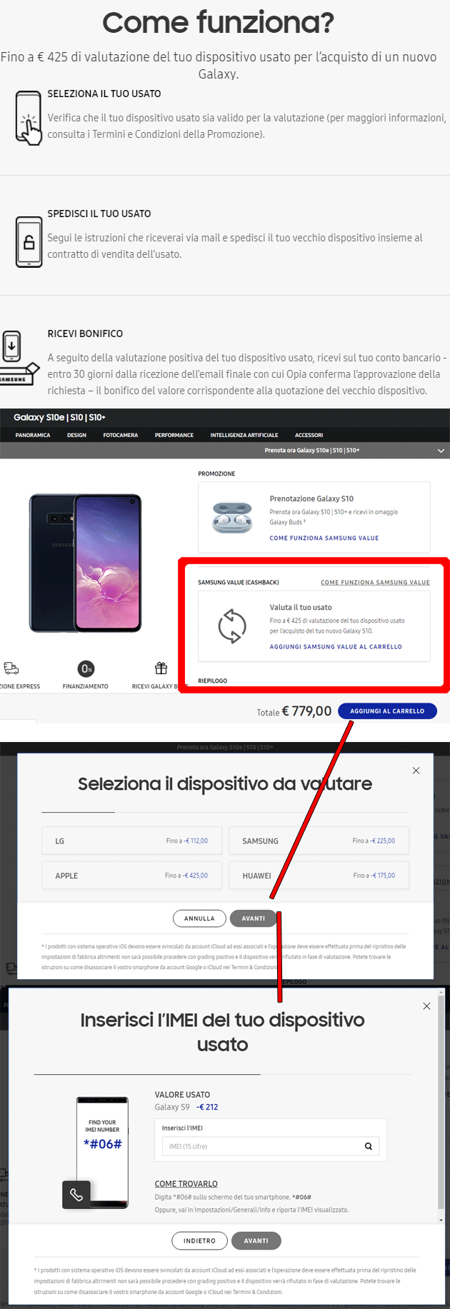 Esempio di richiesta valutazione del vecchio smartphone usato acquistando un nuovo Galaxy S10