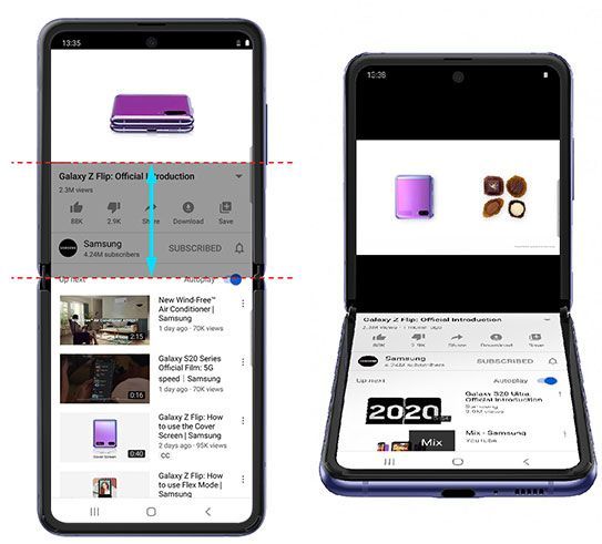 Grazie al sistema pieghevole di Galaxy Z Flip è possibile piegare lo smartphone a 90 gradi, poggiare la parte inferiore su un tavolo e guardare i video di YouTube nella schermata superiore, mentre si può utilizzare la metà inferiore per cercare altri video, leggere descrizioni e scrivere commenti al video in riproduzione nella schermata superiore senza distrazioni.