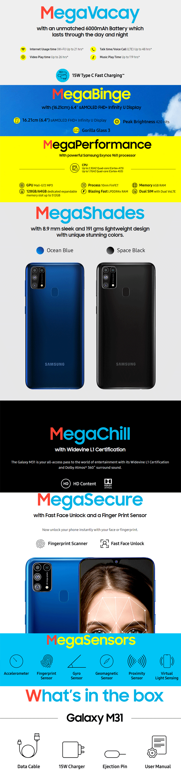 “La serie Galaxy M ha ottenuto un successo senza precedenti nel 2019, con milioni di felici consumatori millenials" ha affermato Asim Warsi, Senior Vice President del Mobile Business di Samsung India. "Galaxy M30s, lanciato prima della stagione delle feste l’anno scorso, era il telefono più venduto nel periodo Diwali. Ora portiamo Galaxy M31 tenendo presente le esigenze e le aspirazioni dei nostri giovani consumatori millenials. Galaxy M31 è l’incarnazione perfetta di #MegaMonster in quanto racchiude una fotocamera Mega da 64MP, una mostruosa batteria da 6000mAh e un display Super Amoled",